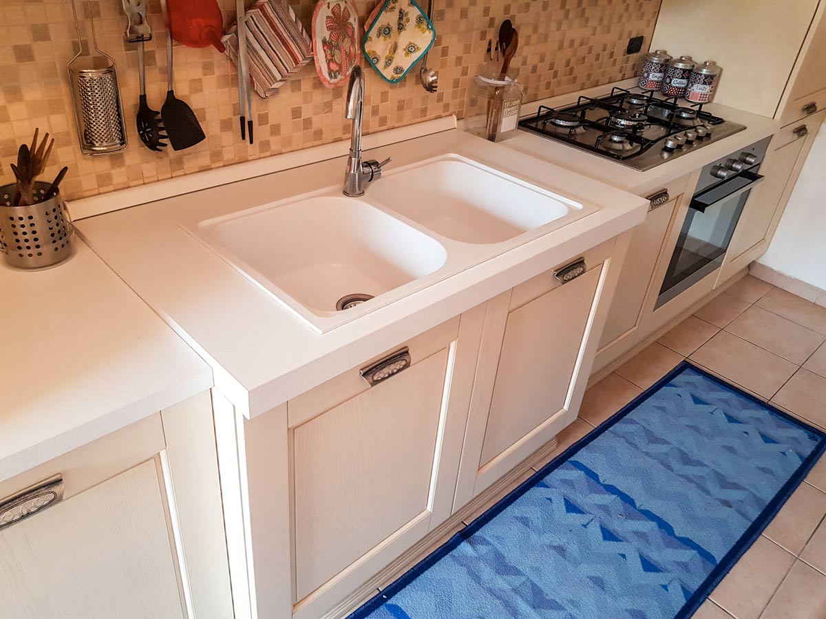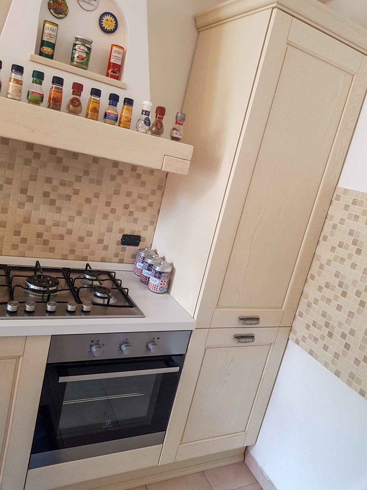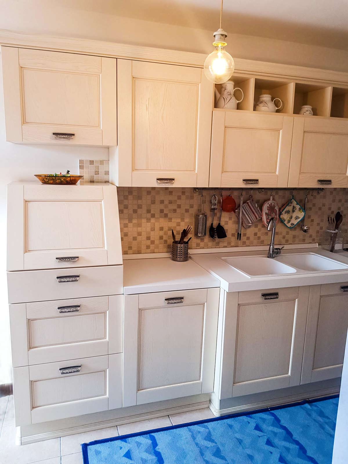 Cucina d’arredo in legno di frassino laccata con corpo avanzato solo nella zona lavello e con piani sopra base dotati di doppi spessori in finta pietra bianca. Molto particolare la cornice sopra pensile e nello zoccolo. Le nicchie realizzate sopra lo scolapiatti permettono di rivivere gli stili delle epoche trascorse. Elegante, funzionale, adatta ad ogni esigenza, un quadretto che ricorda i tempi romantici e felici.
