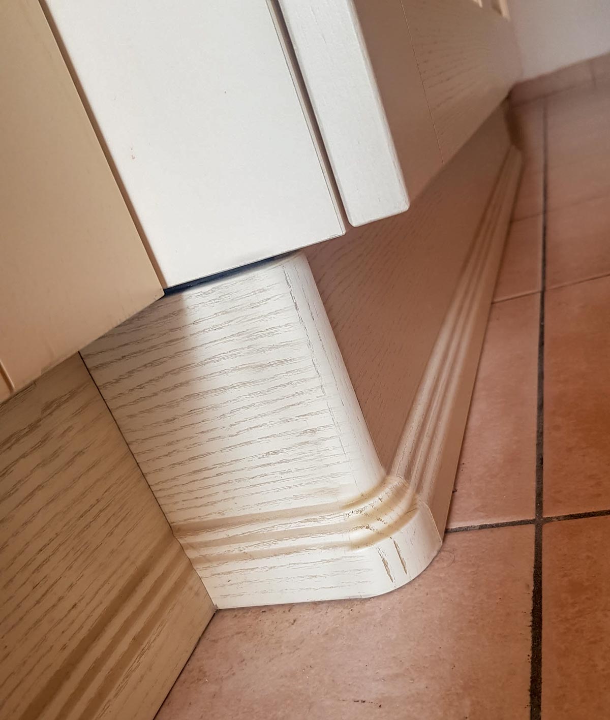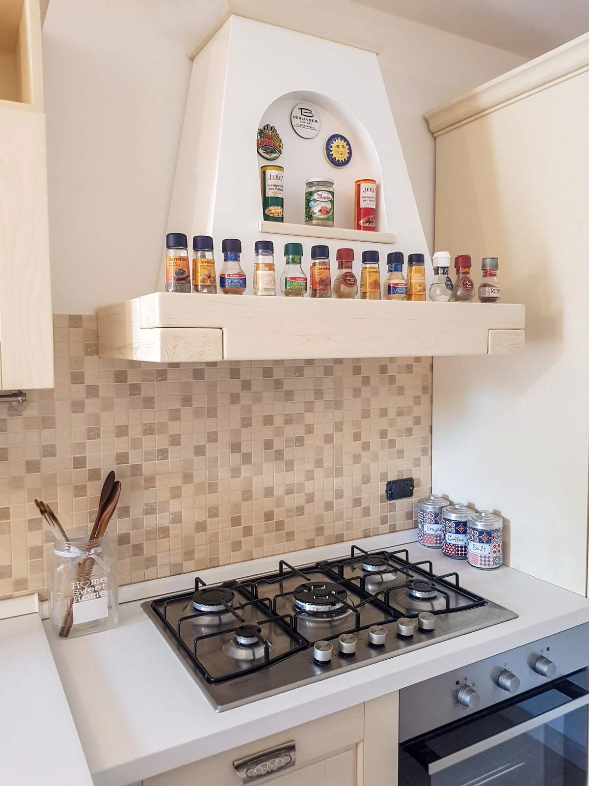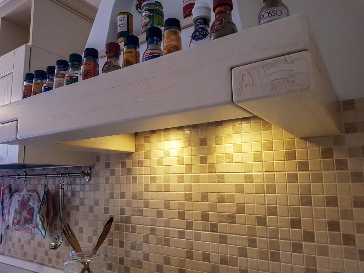 Cucina d’arredo in legno di frassino laccata con corpo avanzato solo nella zona lavello e con piani sopra base dotati di doppi spessori in finta pietra bianca. Molto particolare la cornice sopra pensile e nello zoccolo. Le nicchie realizzate sopra lo scolapiatti permettono di rivivere gli stili delle epoche trascorse. Elegante, funzionale, adatta ad ogni esigenza, un quadretto che ricorda i tempi romantici e felici.