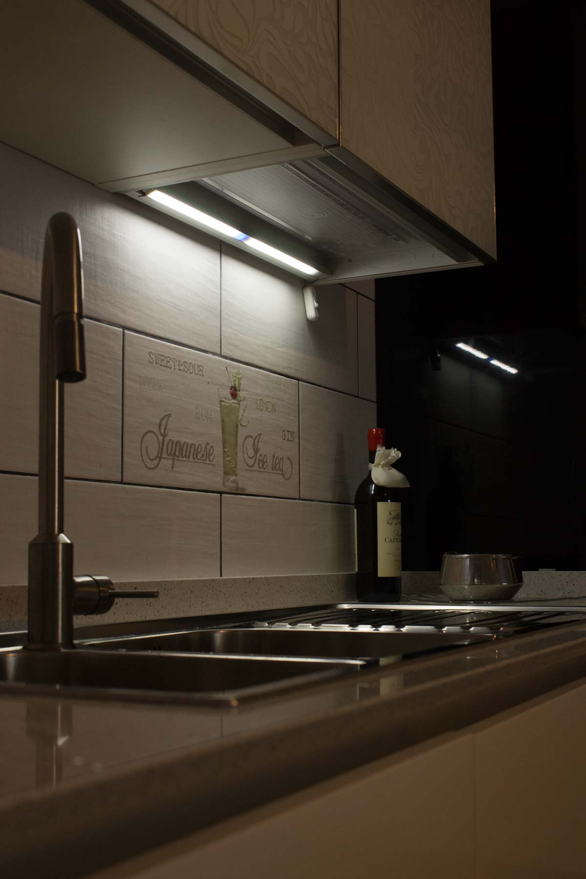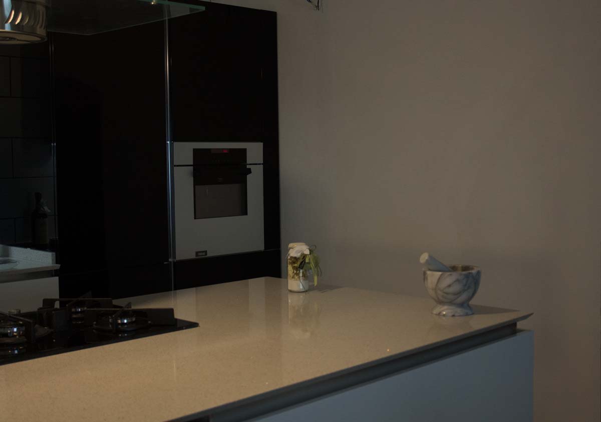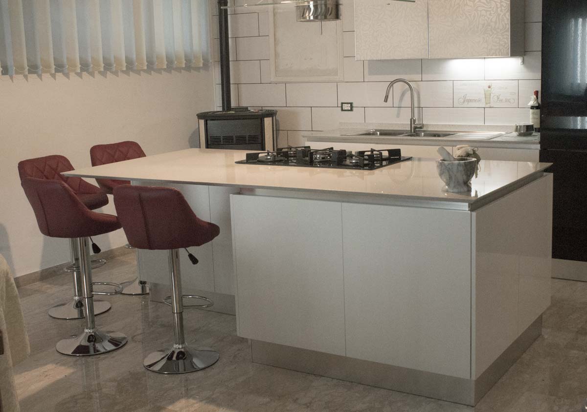 Cucina bianco lucido e nero lucido. Dotata di isola 240x120 cm, con piano cottura in vetro temperato nero e griglie in ghisa. Cappa isola in vetro e acciaio. Ante prive di maniglia, dotate di chiusura ammortizzante, con gole orizzontali su base com e gole verticali fra le colonne. Piano in Okite con microspecchi e lavorazione perimetrale a becco di civetta. Pensili con ante in vetro temperato damascato. Luci led sottopensile con accensione touch.