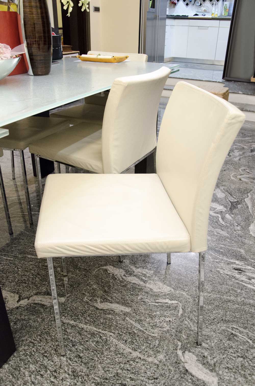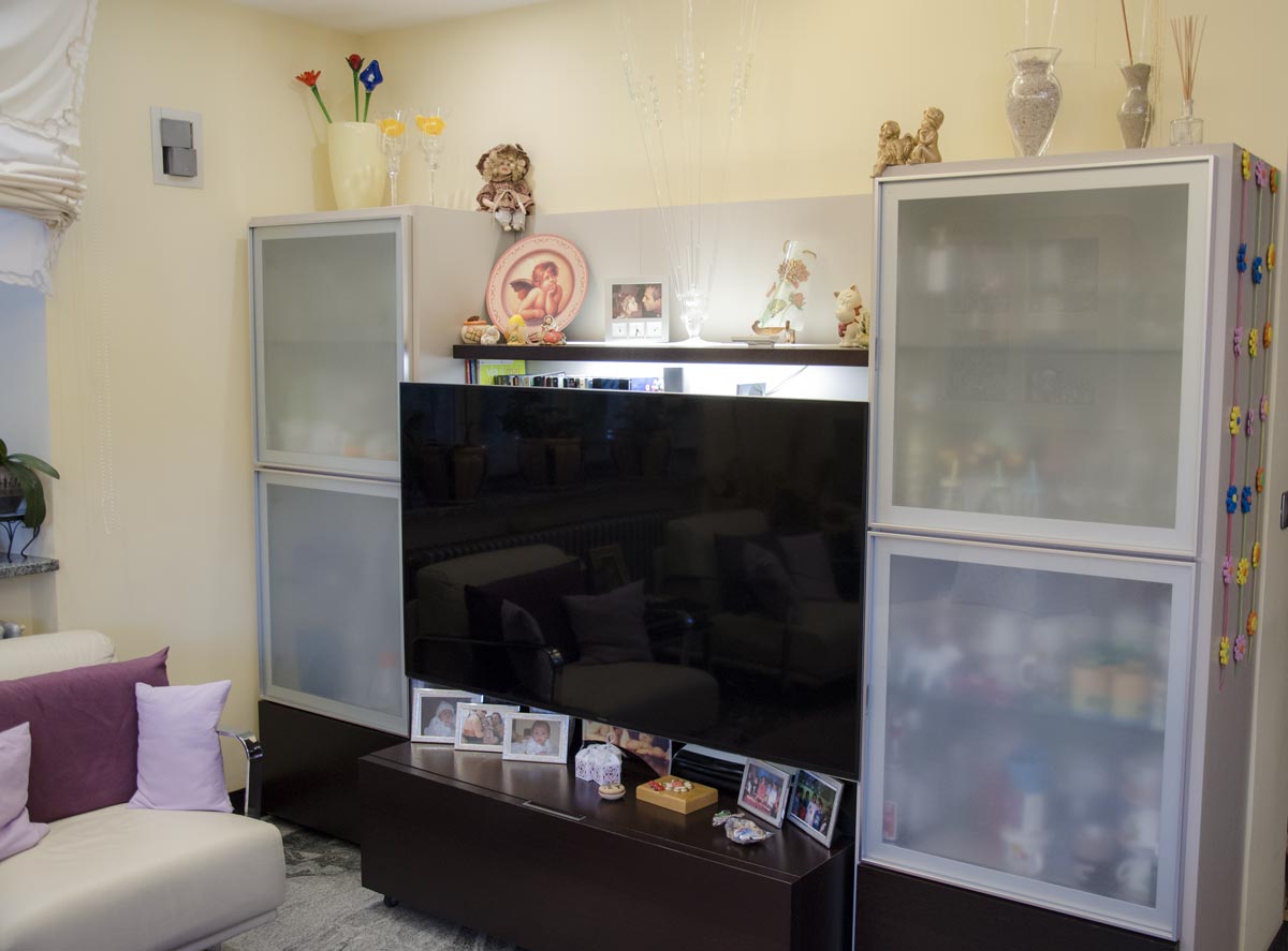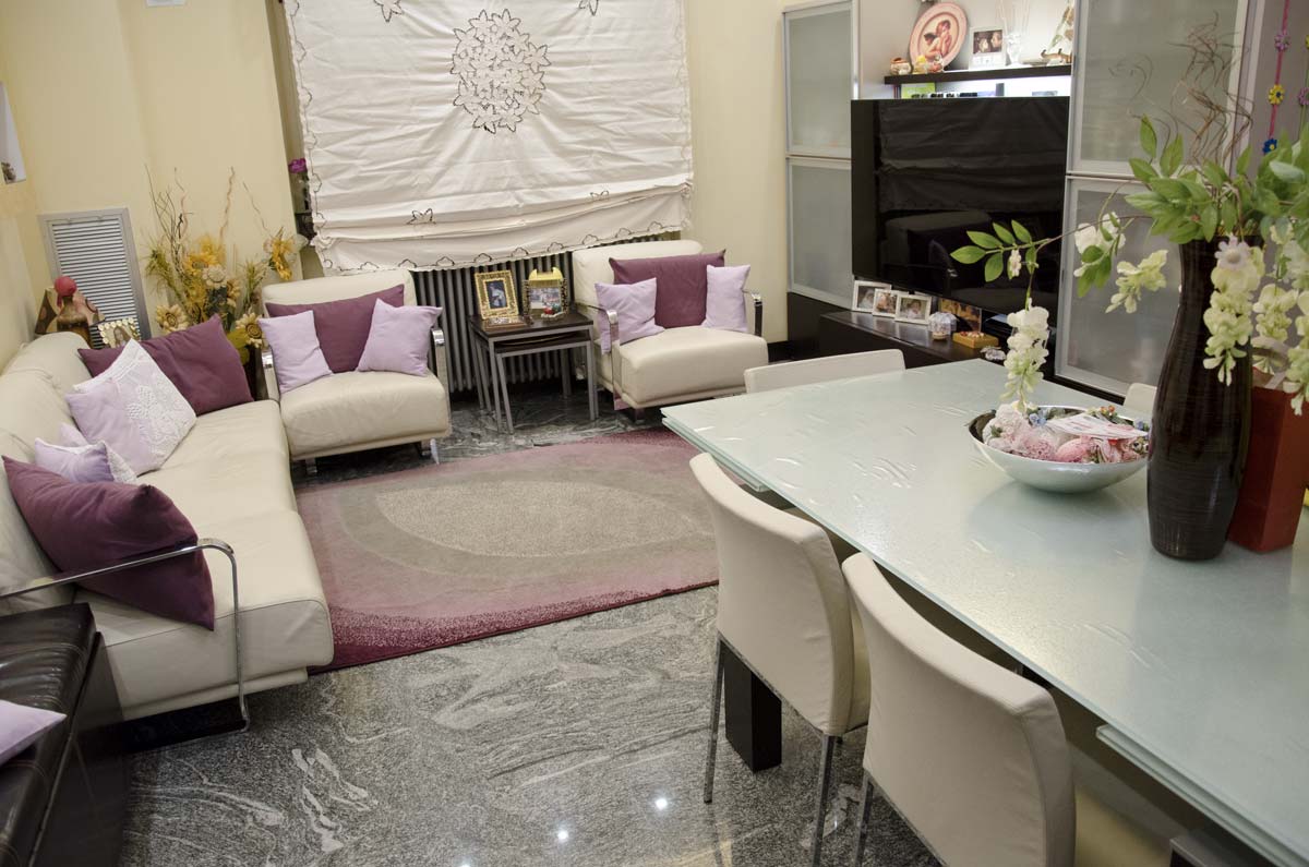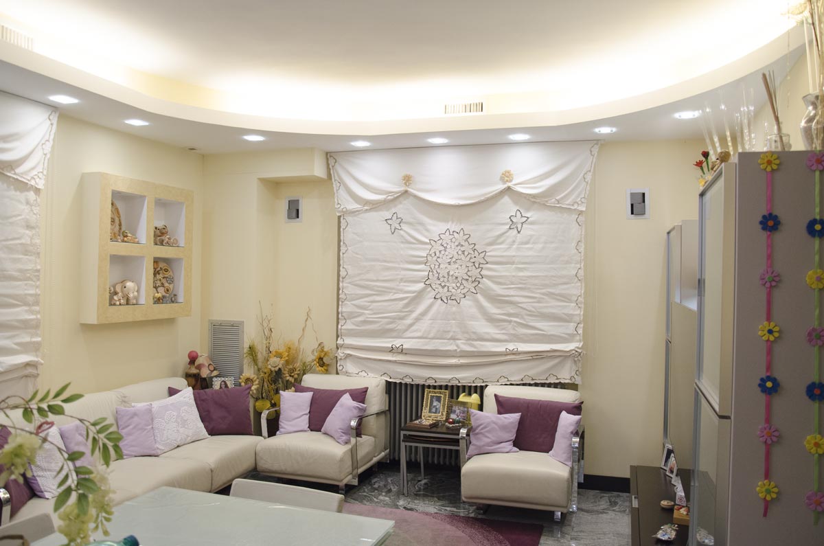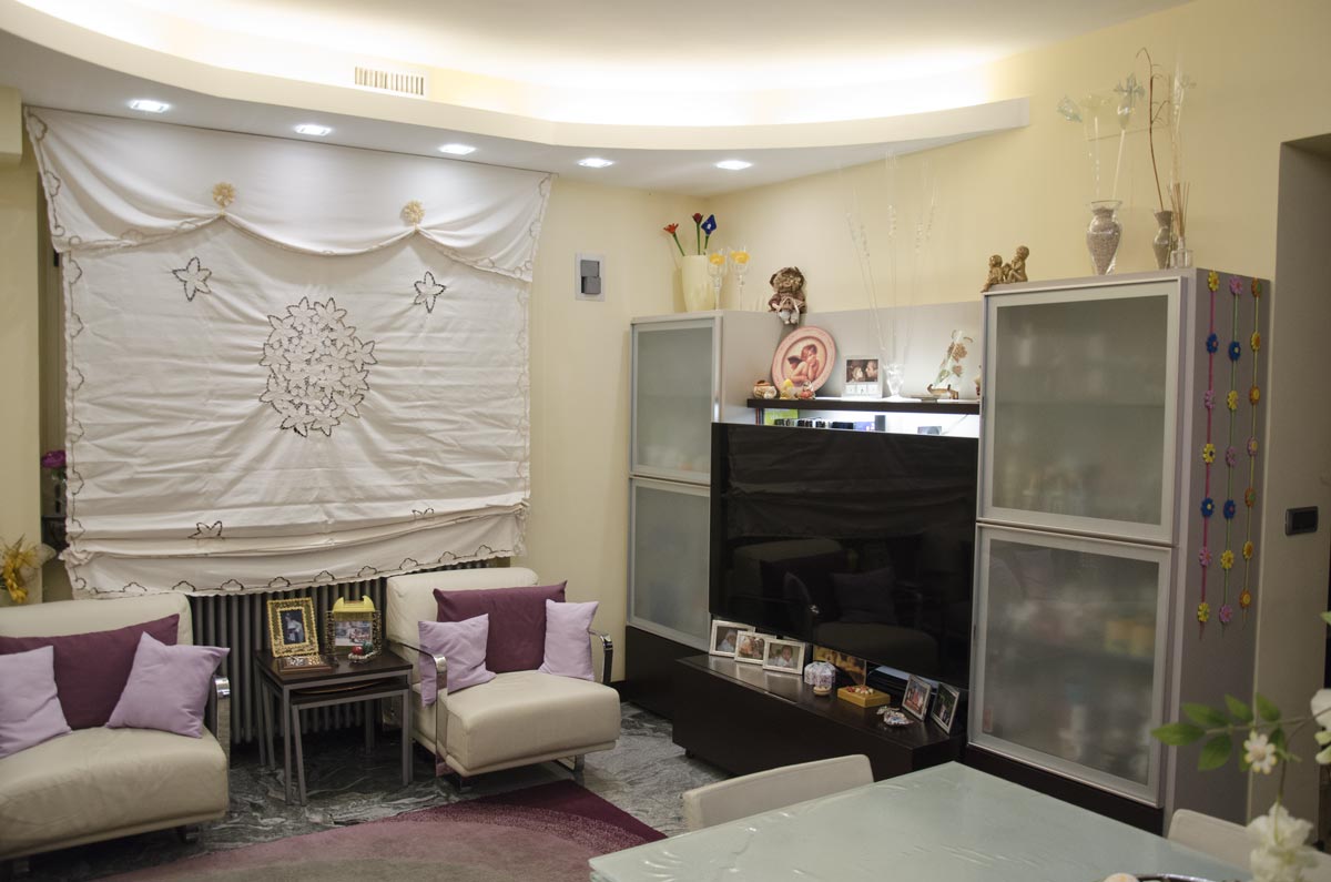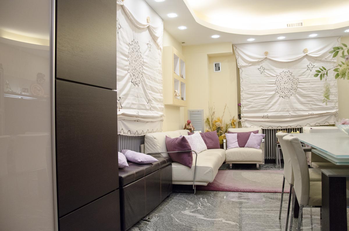 Un living con onde in cartongesso perimetrali sulle pareti alte, con nicchie e piani in cristallo. E’ stata accostata una parete porta TV e una base a cestone contenitore unico e colonne laterali con ante basse in wengè e parte alta in vetro temperato con profili in alluminio satinato di grande spessore. Completa l’arredamento un box armadiato porta bottiglie con incasso colonna in muratura. Il divano, insieme alle poltrone, in pelle beige con particolari cromati, richiamano i famosi anni 70. Il tavolo è in struttura metallica con piano allungabile in cristallo laccato bianco, spessore 12mm. Le sedie sono in struttura metallica rivestite in pelle beige in tinta con divano e poltrone.