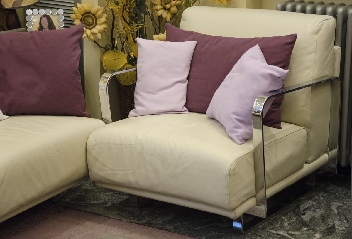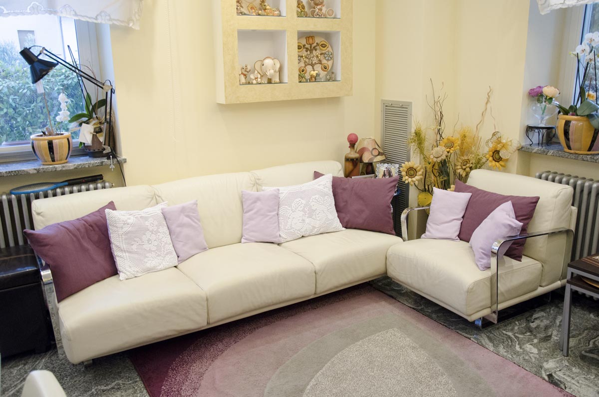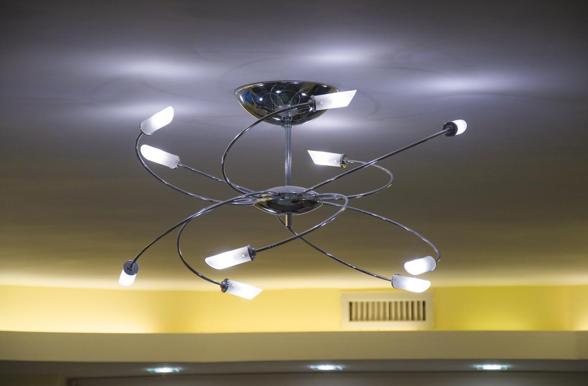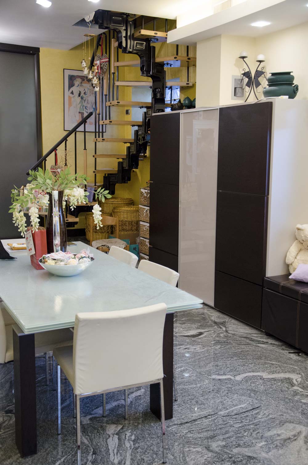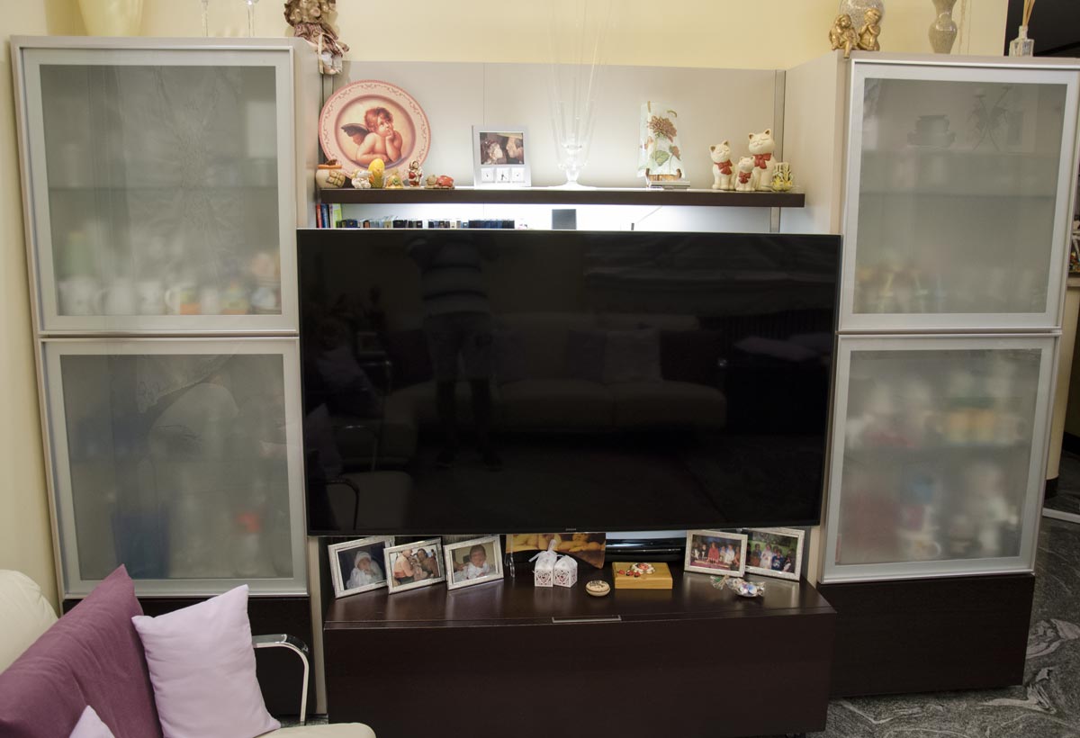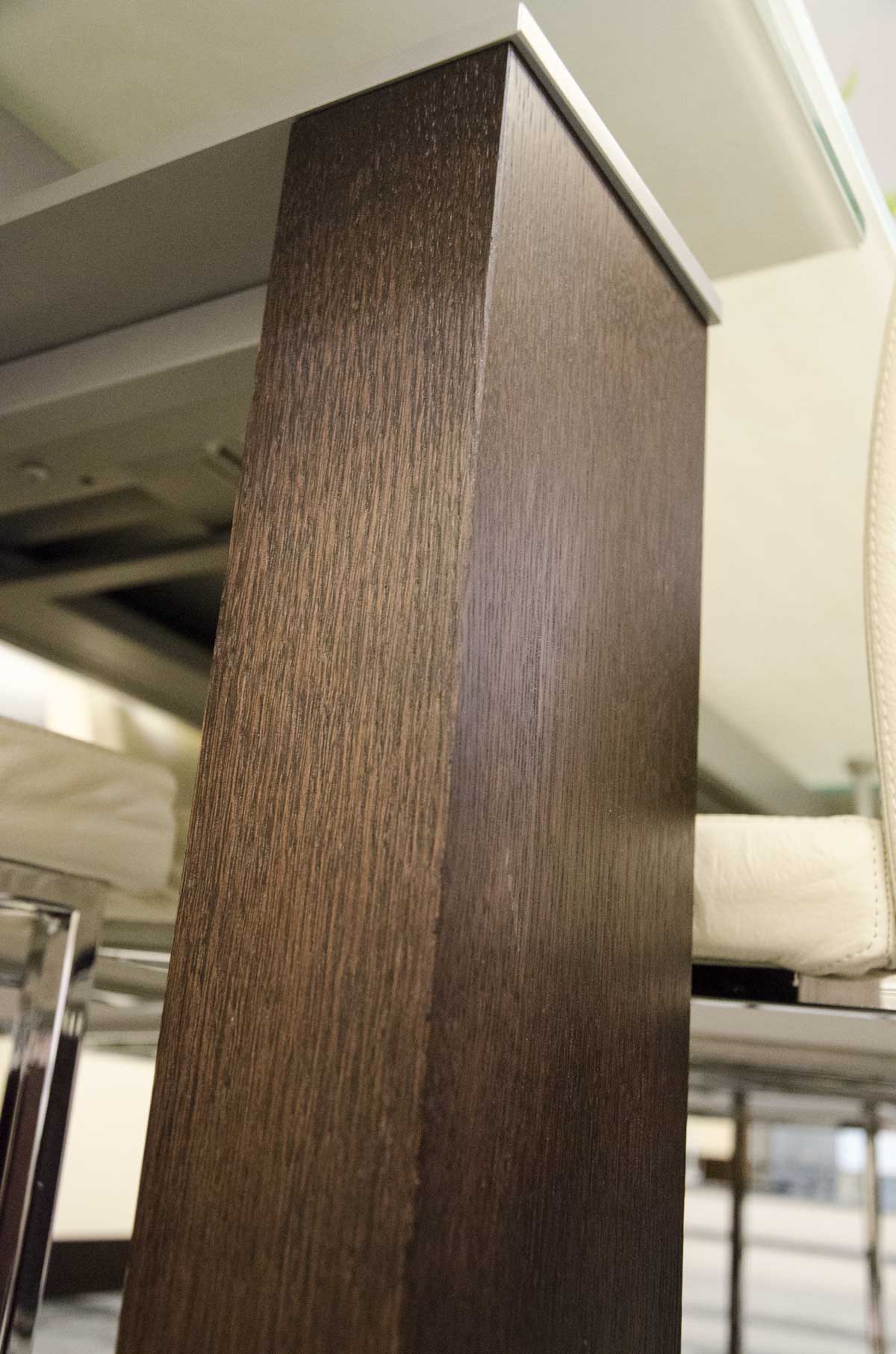 Un living con onde in cartongesso perimetrali sulle pareti alte, con nicchie e piani in cristallo. E’ stata accostata una parete porta TV e una base a cestone contenitore unico e colonne laterali con ante basse in wengè e parte alta in vetro temperato con profili in alluminio satinato di grande spessore. Completa l’arredamento un box armadiato porta bottiglie con incasso colonna in muratura. Il divano, insieme alle poltrone, in pelle beige con particolari cromati, richiamano i famosi anni 70. Il tavolo è in struttura metallica con piano allungabile in cristallo laccato bianco, spessore 12mm. Le sedie sono in struttura metallica rivestite in pelle beige in tinta con divano e poltrone.